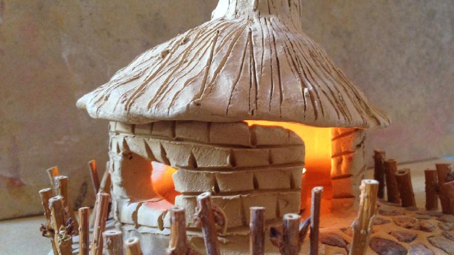 In Aufbautechnik stellen Kinder ein kleines Haus mit Dach her. Das Haus darf winterlich verziert werden und später mit einem Teelicht zum Leuchten gebracht werden.
