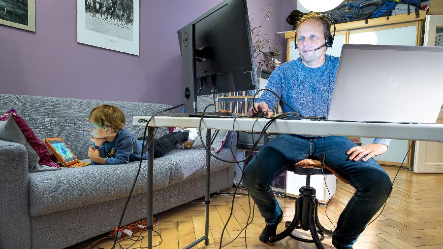 Der Fotograf Werner Bachmeier beobachtet seit vielen Jahren die Veränderungen der Arbeitswelt. Ihn reizen bei diesem Projekt vor allem die Schnittstellen, an denen die Arbeit mit dem Privaten verschmilzt: Eltern, die neben der Erwerbsarbeit auch noch den Haushalt machen und die Kinder betreuen. Singles, die auf einmal daheim Sport machen, weil ihnen sonst die Bewegung fehlt.